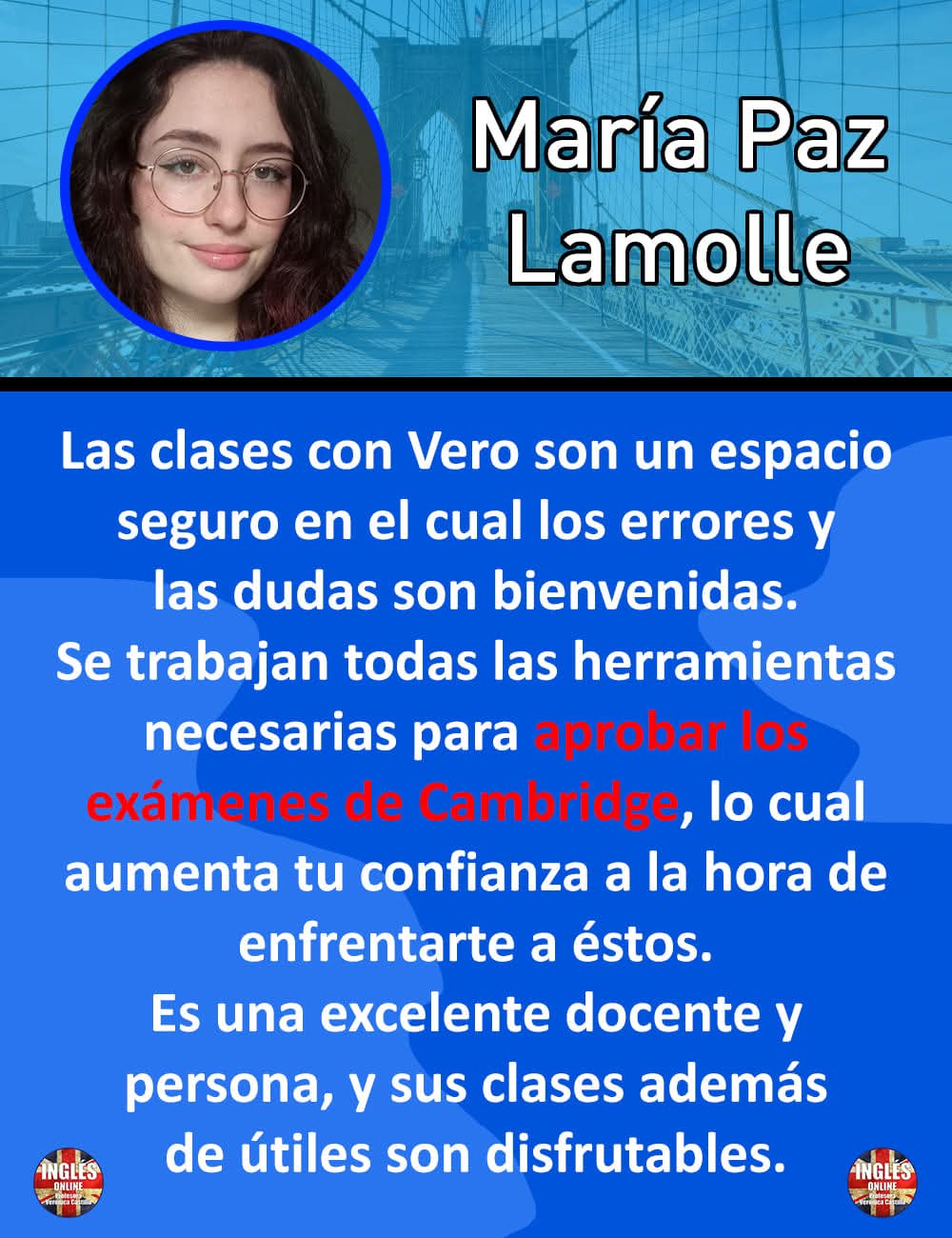 Entiendo que aprender un idioma es sumergirse en su cultura. Por ello, integro en mi formación la experiencia de viajes de estudio a centros académicos de prestigio en el Reino Unido y Estados Unidos, realizados en años anteriores como forma de complementar el desarrollo académico de mis estudiantes.